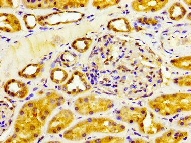 IHC image of CSB-PA006451LA01HU diluted at 1:200 and staining in paraffin-embedded human kidney tissue performed on a Leica BondTM system. After dewaxing and hydration, antigen retrieval was mediated by high pressure in a citrate buffer (pH 6.0). Section was blocked with 10% normal goat serum 30min at RT. Then primary antibody (1% BSA) was incubated at 4°C overnight. The primary is detected by a biotinylated secondary antibody and visualized using an HRP conjugated SP system.
