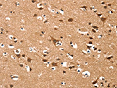 The image on the left is immunohistochemistry of paraffin-embedded Human brain tissue using CSB-PA184126(DAAM1 Antibody) at dilution 1/50, on the right is treated with synthetic peptide. (Original magnification: ×200)