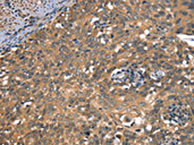 The image on the left is immunohistochemistry of paraffin-embedded Human cervical cancer tissue using CSB-PA184126(DAAM1 Antibody) at dilution 1/50, on the right is treated with synthetic peptide. (Original magnification: ×200)