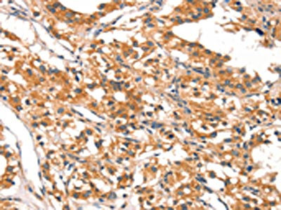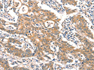 The image on the left is immunohistochemistry of paraffin-embedded Human gastric cancer tissue using CSB-PA167820(DAB2IP Antibody) at dilution 1/20, on the right is treated with synthetic peptide. (Original magnification: ×200)