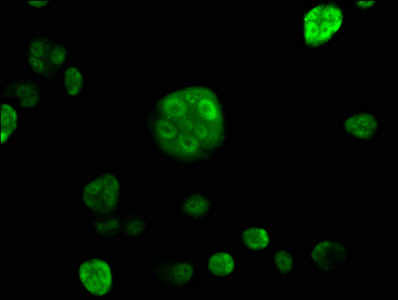 Immunofluorescence staining of MCF-7 cells with CSB-PA00304A0Rb at 1:120, counter-stained with DAPI. The cells were fixed in 4% formaldehyde, permeabilized using 0.2% Triton X-100 and blocked in 10% normal Goat Serum. The cells were then incubated with the antibody overnight at 4°C. The secondary antibody was Alexa Fluor 488-congugated AffiniPure Goat Anti-Rabbit IgG(H+L).