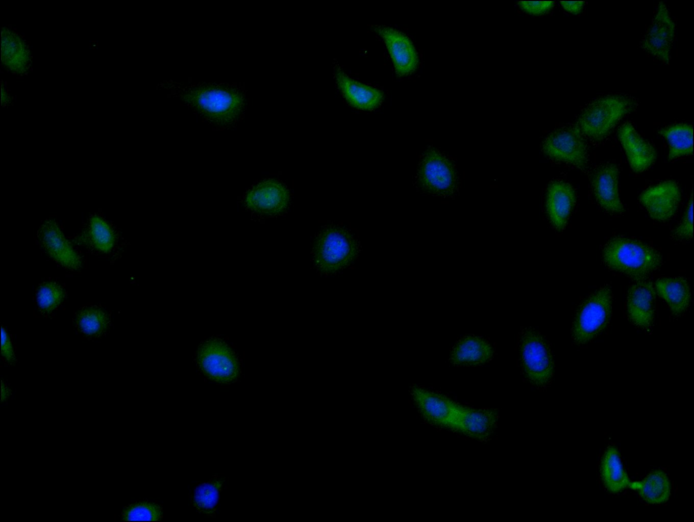 Immunofluorescence staining of HepG2 cell with CSB-PA006621LA01HU at 1:200, counter-stained with DAPI. The cells were fixed in 4% formaldehyde and blocked in 10% normal Goat Serum. The cells were then incubated with the antibody overnight at 4C. The secondary antibody was Alexa Fluor 488-congugated AffiniPure Goat Anti-Rabbit IgG(H+L).