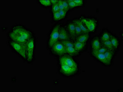 Immunofluorescent analysis of HepG2 cells using CSB-PA882074LA01HU at dilution of 1:100 and Alexa Fluor 488-congugated AffiniPure Goat Anti-Rabbit IgG(H+L)