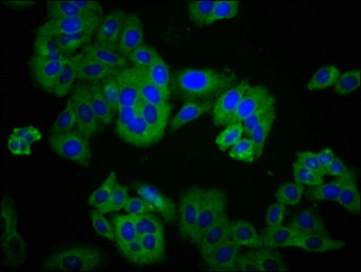 Immunofluorescence staining of HepG2 cells with CSB-PA621882LA01HU at 1:233, counter-stained with DAPI. The cells were fixed in 4% formaldehyde, permeabilized using 0.2% Triton X-100 and blocked in 10% normal Goat Serum. The cells were then incubated with the antibody overnight at 4°C. The secondary antibody was Alexa Fluor 488-congugated AffiniPure Goat Anti-Rabbit IgG(H+L).