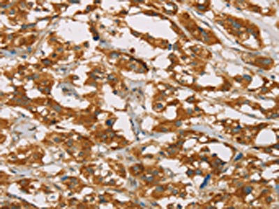 The image on the left is immunohistochemistry of paraffin-embedded Human breast cancer tissue using CSB-PA831848(DLL4 Antibody) at dilution 1/50, on the right is treated with fusion protein. (Original magnification: ×200)
