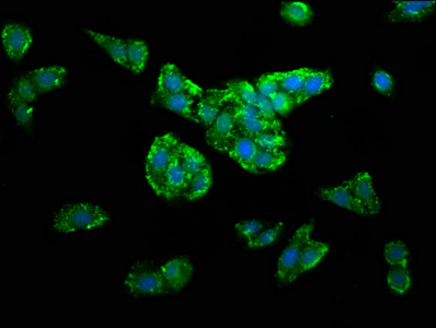 Immunofluorescence staining of HepG2 cells with CSB-PA861526LA01HU at 1:100, counter-stained with DAPI. The cells were fixed in 4% formaldehyde, permeabilized using 0.2% Triton X-100 and blocked in 10% normal Goat Serum. The cells were then incubated with the antibody overnight at 4°C. The secondary antibody was Alexa Fluor 488-congugated AffiniPure Goat Anti-Rabbit IgG(H+L).