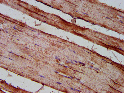 IHC image of CSB-PA006963LA01HU diluted at 1:200 and staining in paraffin-embedded human skeletal muscle tissue performed on a Leica BondTM system. After dewaxing and hydration, antigen retrieval was mediated by high pressure in a citrate buffer (pH 6.0). Section was blocked with 10% normal goat serum 30min at RT. Then primary antibody (1% BSA) was incubated at 4°C overnight. The primary is detected by a biotinylated secondary antibody and visualized using an HRP conjugated SP system.