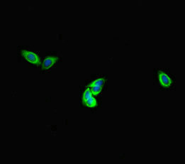 Immunofluorescent analysis of HepG2 cells using CSB-PA878961LA01HU at dilution of 1:100 and Alexa Fluor 488-congugated AffiniPure Goat Anti-Rabbit IgG(H+L)