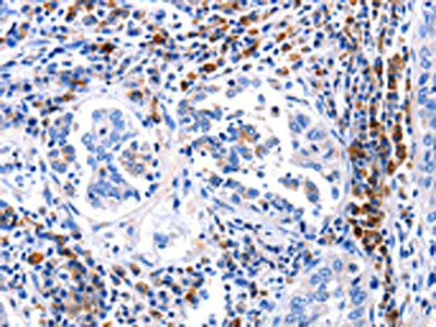 The image on the left is immunohistochemistry of paraffin-embedded Human lung cancer tissue using CSB-PA338014(DOK3 Antibody) at dilution 1/25, on the right is treated with fusion protein. (Original magnification: ×200)