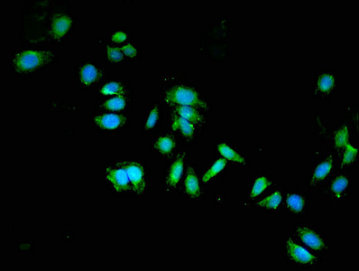 Immunofluorescent analysis of HepG2 cells using CSB-PA614975YA01HU at dilution of 1:100 and Alexa Fluor 488-congugated AffiniPure Goat Anti-Rabbit IgG(H+L)