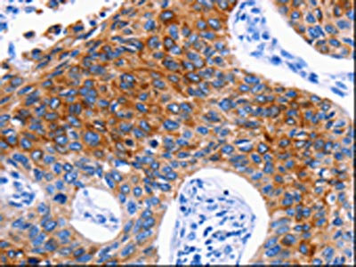 The image on the left is immunohistochemistry of paraffin-embedded Human gastric cancer tissue using CSB-PA967891(DRD4 Antibody) at dilution 1/30, on the right is treated with synthetic peptide. (Original magnification: ×200)