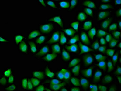 Immunofluorescence staining of Hela cells with CSB-PA856442LA01HU at 1:66, counter-stained with DAPI. The cells were fixed in 4% formaldehyde, permeabilized using 0.2% Triton X-100 and blocked in 10% normal Goat Serum. The cells were then incubated with the antibody overnight at 4°C. The secondary antibody was Alexa Fluor 488-congugated AffiniPure Goat Anti-Rabbit IgG(H+L).