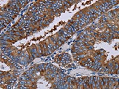 The image on the left is immunohistochemistry of paraffin-embedded Human colon cancer tissue using CSB-PA093669(EDNRB Antibody) at dilution 1/30, on the right is treated with synthetic peptide. (Original magnification: ×200)