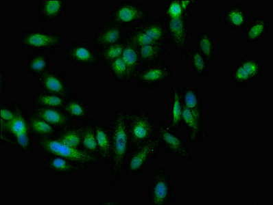 Immunofluorescent analysis of Hela cells using CSB-PA007405LA01HU at dilution of 1:100 and Alexa Fluor 488-congugated AffiniPure Goat Anti-Rabbit IgG(H+L)