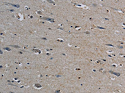 The image on the left is immunohistochemistry of paraffin-embedded Human brain tissue using CSB-PA154507(EIF2AK3 Antibody) at dilution 1/50, on the right is treated with synthetic peptide. (Original magnification: ×200)
