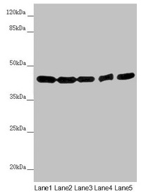 Lane 1: Rabbit control IgG instead of (1µg) instead of CSB-PA745333DSR1HU in Hela whole cell lysate. For western blotting, a HRP-conjugated light chain specific antibody was used as the Secondary antibody (1/50000)