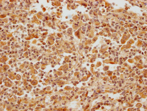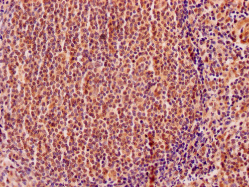 IHC image of CSB-PA007573HA01HU diluted at 1:200 and staining in paraffin-embedded human tonsil tissue performed on a Leica BondTM system. After dewaxing and hydration, antigen retrieval was mediated by high pressure in a citrate buffer (pH 6.0). Section was blocked with 10% normal goat serum 30min at RT. Then primary antibody (1% BSA) was incubated at 4°C overnight. The primary is detected by a Goat anti-rabbit polymer IgG labeled by HRP and visualized using 0.05% DAB.