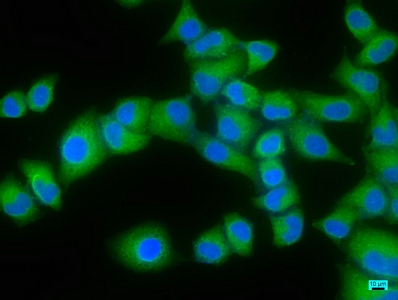 Immunofluorescence staining of Hela cells with CSB-PA007598LA01HU at 1:166, counter-stained with DAPI. The cells were fixed in 4% formaldehyde, permeabilized using 0.2% Triton X-100 and blocked in 10% normal Goat Serum. The cells were then incubated with the antibody overnight at 4°C. The secondary antibody was Alexa Fluor 488-congugated AffiniPure Goat Anti-Rabbit IgG(H+L).
