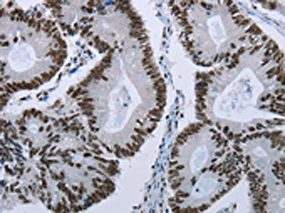 The image on the left is immunohistochemistry of paraffin-embedded Human colon cancer tissue using CSB-PA583825(ELN Antibody) at dilution 1/50, on the right is treated with fusion protein. (Original magnification: ×200)