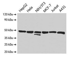 Positive WB detected in: HepG2 whole cell lysate, Hela whole cell lysate, NIH/3T3 whole cell lysate, MCF-7 whole cell lysate, Jurkat whole cell lysate, A431 whole cell lysate