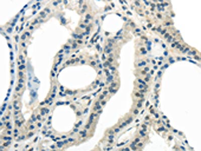The image on the left is immunohistochemistry of paraffin-embedded Human thyroid cancer tissue using CSB-PA981013(ENTPD1 Antibody) at dilution 1/25, on the right is treated with synthetic peptide. (Original magnification: ×200)