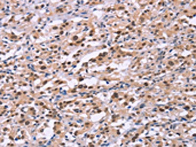 The image on the left is immunohistochemistry of paraffin-embedded Human gastic cancer tissue using CSB-PA715796(EP300 Antibody) at dilution 1/20, on the right is treated with synthetic peptide. (Original magnification: ×200)