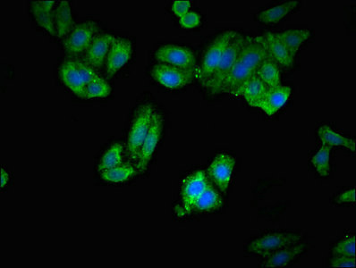 Immunofluorescent analysis of HepG2 cells using CSB-PA007760LA01HU at dilution of 1:100 and Alexa Fluor 488-congugated AffiniPure Goat Anti-Rabbit IgG(H+L)