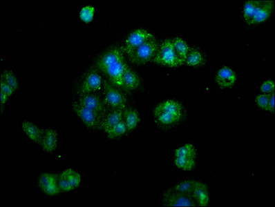 Immunofluorescence staining of HepG2 cells with CSB-PA22449A0Rb at 1:133, counter-stained with DAPI. The cells were fixed in 4% formaldehyde, permeabilized using 0.2% Triton X-100 and blocked in 10% normal Goat Serum. The cells were then incubated with the antibody overnight at 4°C. The secondary antibody was Alexa Fluor 488-congugated AffiniPure Goat Anti-Rabbit IgG(H+L).