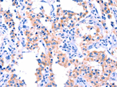 The image on the left is immunohistochemistry of paraffin-embedded Human thyroid cancer tissue using CSB-PA436972(ERN2 Antibody) at dilution 1/40, on the right is treated with synthetic peptide. (Original magnification: ×200)
