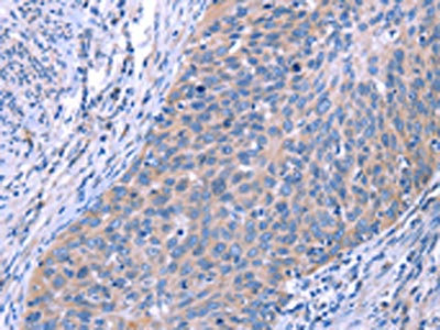 The image on the left is immunohistochemistry of paraffin-embedded Human cervical cancer tissue using CSB-PA644588(ESPL1 Antibody) at dilution 1/40, on the right is treated with synthetic peptide. (Original magnification: ×200)