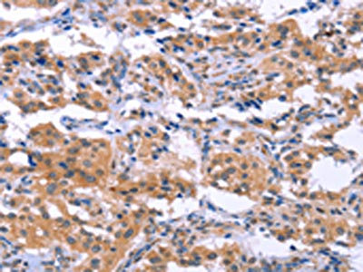 The image on the left is immunohistochemistry of paraffin-embedded Human thyroid cancer tissue using CSB-PA644588(ESPL1 Antibody) at dilution 1/40, on the right is treated with synthetic peptide. (Original magnification: ×200)