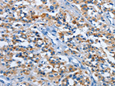 The image on the left is immunohistochemistry of paraffin-embedded Human thyroid cancer tissue using CSB-PA808765(ETHE1 Antibody) at dilution 1/20, on the right is treated with fusion protein. (Original magnification: ×200)