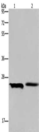 Gel: 10%SDS-PAGE, Lysate: 40 μg, Lane 1-2: A549 cells, mouse liver tissue, Primary antibody: CSB-PA808765(ETHE1 Antibody) at dilution 1/200, Secondary antibody: Goat anti rabbit IgG at 1/8000 dilution, Exposure time: 40 seconds