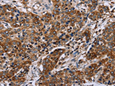 The image on the left is immunohistochemistry of paraffin-embedded Human liver cancer tissue using CSB-PA993404(FAF1 Antibody) at dilution 1/50, on the right is treated with synthetic peptide. (Original magnification: ×200)