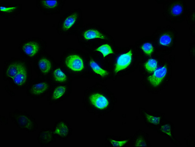 Immunofluorescence staining of A549 cells with CSB-PA854045LA01HU at 1:33, counter-stained with DAPI. The cells were fixed in 4% formaldehyde, permeabilized using 0.2% Triton X-100 and blocked in 10% normal Goat Serum. The cells were then incubated with the antibody overnight at 4°C. The secondary antibody was Alexa Fluor 488-congugated AffiniPure Goat Anti-Rabbit IgG(H+L).