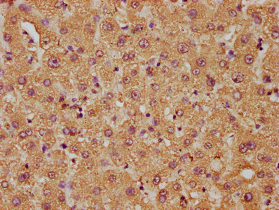 IHC image of CSB-PA854045LA01HU diluted at 1:50 and staining in paraffin-embedded human liver tissue performed on a Leica BondTM system. After dewaxing and hydration, antigen retrieval was mediated by high pressure in a citrate buffer (pH 6.0). Section was blocked with 10% normal goat serum 30min at RT. Then primary antibody (1% BSA) was incubated at 4°C overnight. The primary is detected by a biotinylated secondary antibody and visualized using an HRP conjugated SP system.