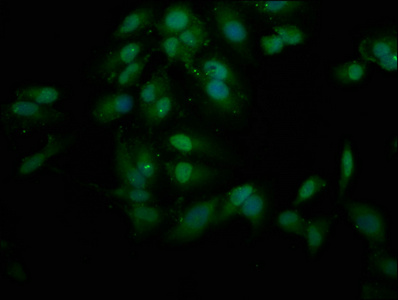 Immunofluorescence staining of Hela cells with CSB-PA882120LA01HU at 1:200, counter-stained with DAPI. The cells were fixed in 4% formaldehyde, permeabilized using 0.2% Triton X-100 and blocked in 10% normal Goat Serum. The cells were then incubated with the antibody overnight at 4°C. The secondary antibody was Alexa Fluor 488-congugated AffiniPure Goat Anti-Rabbit IgG(H+L).