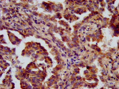 IHC image of CSB-PA882120LA01HU diluted at 1:600 and staining in paraffin-embedded human lung cancer performed on a Leica BondTM system. After dewaxing and hydration, antigen retrieval was mediated by high pressure in a citrate buffer (pH 6.0). Section was blocked with 10% normal goat serum 30min at RT. Then primary antibody (1% BSA) was incubated at 4°C overnight. The primary is detected by a biotinylated secondary antibody and visualized using an HRP conjugated SP system.