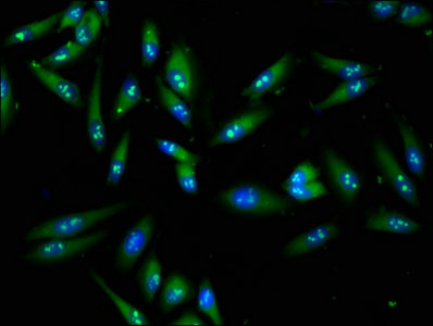 Immunofluorescence staining of Hela cells with CSB-PA13179A0Rb at 1:100, counter-stained with DAPI. The cells were fixed in 4% formaldehyde, permeabilized using 0.2% Triton X-100 and blocked in 10% normal Goat Serum. The cells were then incubated with the antibody overnight at 4°C. The secondary antibody was Alexa Fluor 488-congugated AffiniPure Goat Anti-Rabbit IgG(H+L).