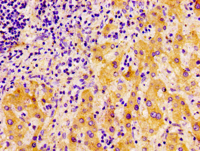 IHC image of CSB-PA13179A0Rb diluted at 1:100 and staining in paraffin-embedded human liver cancer performed on a Leica BondTM system. After dewaxing and hydration, antigen retrieval was mediated by high pressure in a citrate buffer (pH 6.0). Section was blocked with 10% normal goat serum 30min at RT. Then primary antibody (1% BSA) was incubated at 4°C overnight. The primary is detected by a biotinylated secondary antibody and visualized using an HRP conjugated ABC system.