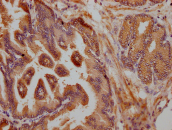IHC image of CSB-PA008452LA01HU diluted at 1:200 and staining in paraffin-embedded human prostate tissue performed on a Leica BondTM system. After dewaxing and hydration, antigen retrieval was mediated by high pressure in a citrate buffer (pH 6.0). Section was blocked with 10% normal goat serum 30min at RT. Then primary antibody (1% BSA) was incubated at 4°C overnight. The primary is detected by a Goat anti-rabbit polymer IgG labeled by HRP and visualized using 0.05% DAB.