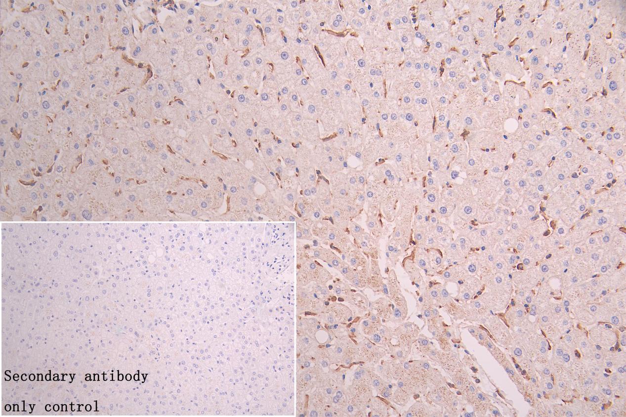 IHC image of CSB-PA854115ESR1HU diluted at 1:200 and staining in paraffin-embedded human liver tissue performed on a Leica BondTM system. After dewaxing and hydration, antigen retrieval was mediated by high pressure in a citrate buffer (pH 6.0). Section was blocked with 10% normal goat serum 30min at RT. Then primary antibody (1% BSA) was incubated at 4°C overnight. The primary is detected by a Goat anti-rabbit polymer IgG labeled by HRP and visualized using 0.05% DAB. Secondary antibody only control: uses 1% BSA instead of primary antibody