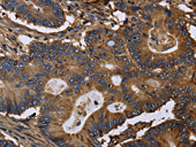 The image on the left is immunohistochemistry of paraffin-embedded Human colon cancer tissue using CSB-PA237744(FGB Antibody) at dilution 1/20, on the right is treated with fusion protein. (Original magnification: ×200)