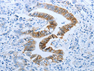 The image on the left is immunohistochemistry of paraffin-embedded Human gastric cancer tissue using CSB-PA449957(FGF1 Antibody) at dilution 1/25, on the right is treated with synthetic peptide. (Original magnification: ×200)