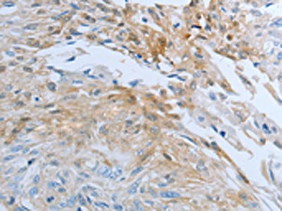 The image on the left is immunohistochemistry of paraffin-embedded Human esophagus cancer tissue using CSB-PA449957(FGF1 Antibody) at dilution 1/25, on the right is treated with synthetic peptide. (Original magnification: ×200)
