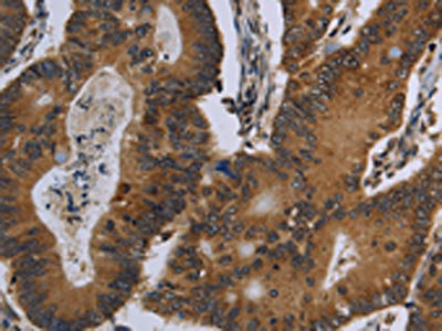The image on the left is immunohistochemistry of paraffin-embedded Human colon cancer tissue using CSB-PA120525(FGF18 Antibody) at dilution 1/20, on the right is treated with fusion protein. (Original magnification: ×200)