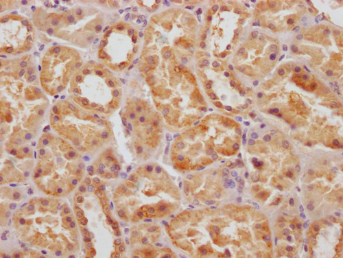IHC image of CSB-PA008624EA01HU diluted at 1:200 and staining in paraffin-embedded human kidney tissue performed on a Leica BondTM system. After dewaxing and hydration, antigen retrieval was mediated by high pressure in a citrate buffer (pH 6.0). Section was blocked with 10% normal goat serum 30min at RT. Then primary antibody (1% BSA) was incubated at 4°C overnight. The primary is detected by a Goat anti-rabbit polymer IgG labeled by HRP and visualized using 0.05% DAB.