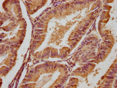 IHC image of CSB-PA008631OA01HU diluted at 1:300 and staining in paraffin-embedded human endometrial cancer performed on a Leica BondTM system. After dewaxing and hydration, antigen retrieval was mediated by high pressure in a citrate buffer (pH 6.0). Section was blocked with 10% normal goat serum 30min at RT. Then primary antibody (1% BSA) was incubated at 4°C overnight. The primary is detected by a biotinylated secondary antibody and visualized using an HRP conjugated SP system.