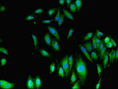 Immunofluorescent analysis of Hela cells using CSB-PA008659LA01HU at dilution of 1:100 and Alexa Fluor 488-congugated AffiniPure Goat Anti-Rabbit IgG(H+L)