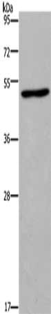 Gel: 10%SDS-PAGE, Lysate: 40 μg, Lane: Hela cells, Primary antibody: CSB-PA191502(FOS Antibody) at dilution 1/400, Secondary antibody: Goat anti rabbit IgG at 1/8000 dilution, Exposure time: 15 seconds